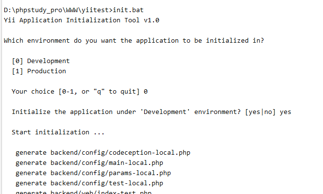 进入项目根目录执行init.bat初始化脚本,设置安装的环境,选择开发环境(Develoment)or生产环境(Production),输入yes进行确定。【该步骤是生成配置信息】